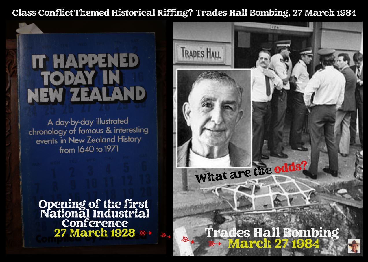 Yet, the prima facie evidence presented in this Darkest Days by Dates Down Under” dispatch, indicates that a criminal deep state network operating in New Zealand, has been able to sustain the mystery over the Trades Hall Bombing for four decades. They appear to enjoy their prowess for penetrating institutions to control probes. The apparent metaphors codified into the Trades Hall Bombing of 27 March 1984, seem to communicate a capitalist class superiority complex over the unions of New Zealand.