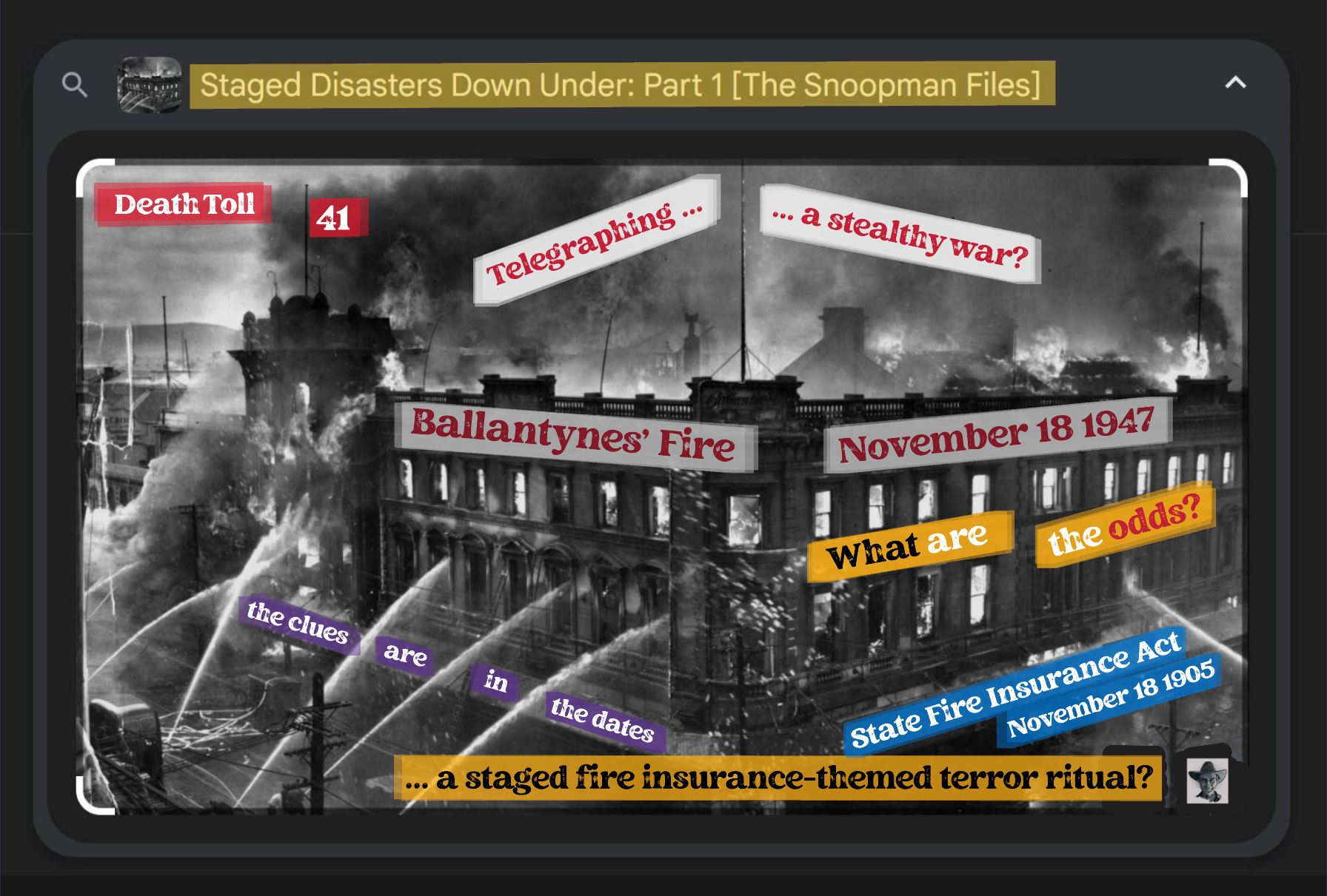 Key Finding: The Ballantynes’ Fire of November 18 1947 was a ritualized baptism of fire. This horrific ‘worst of type’ fire was deliberately staged as a ritual sacrifice to telegraph a new kind of warfare, where the citizens would be targetted with weaponized mayhem to compromise officials in cover-ups to reset the political center of gravity. The themed date riffing is the dead giveaway.
